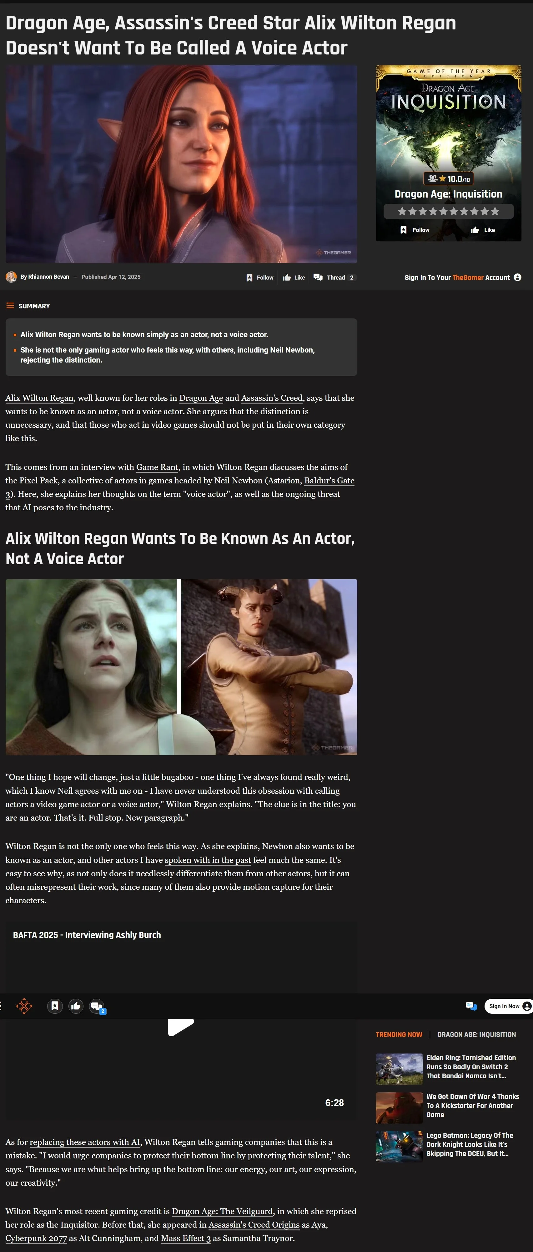 Link to article: Dragon Age, Assassin's Creed Star Alix Wilton Regan Doesn't Want To Be Called A Voice Actor Alix ReganAugust 22, 2025 Facebook0 Twitter LinkedIn0 Reddit Tumblr Pinterest0 0 Likes